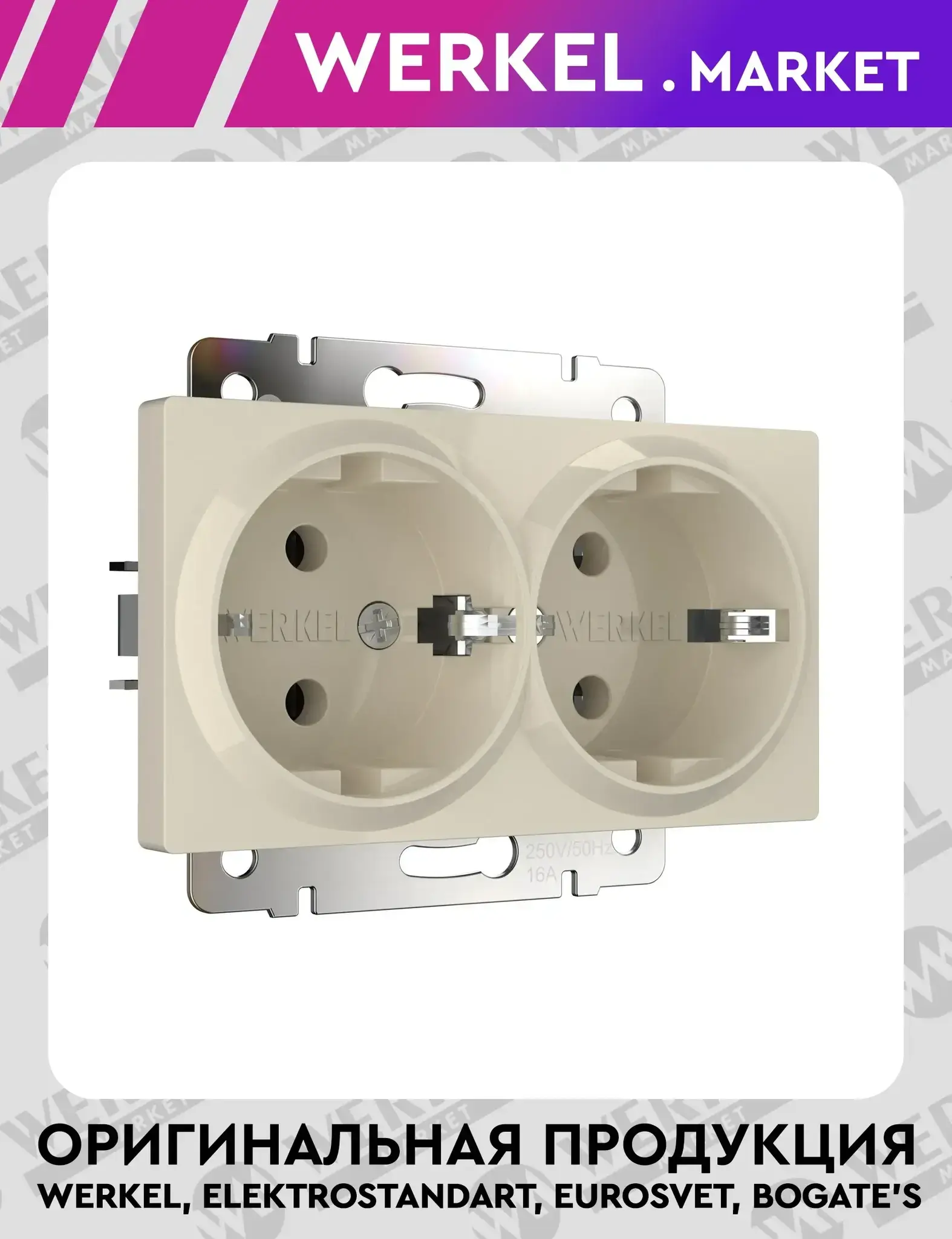 Двойная розетка с заземлением напряжением 220 В и силой тока 16 А является неотъемлемой частью любого помещения и служит для подключения разнообразной техники к электрической сети. Данные розетки применяются как в жилых квартирах и частных домах, так и в коммерческих зданиях, устанавливаясь в наиболее подходящих для этого местах. Основные части механизма розетки изготавливаются из нержавеющей стали и монтируются в монтажную коробку с фиксацией посредством винтов и распорных лапок. Подключение кабелей сечением от 0.75 мм² до 2.5 мм², осуществляется через винтовую клемму, что делает процесс установки очень простым и удобным. Контакты из фосфористой бронзы и серебра, которые могут выдержать значительные нагрузки, обладают долговечностью и рассчитаны на 40 000 циклов эксплуатации. Лицевая панель изготовлена из качественного поликарбоната, который устойчив к высоким температурам. Двойная розетка встраиваемой серии Werkel подходит ко всем рамкам коллекции Werkel, отличается простотой использования и обеспечивает стабильный контакт.