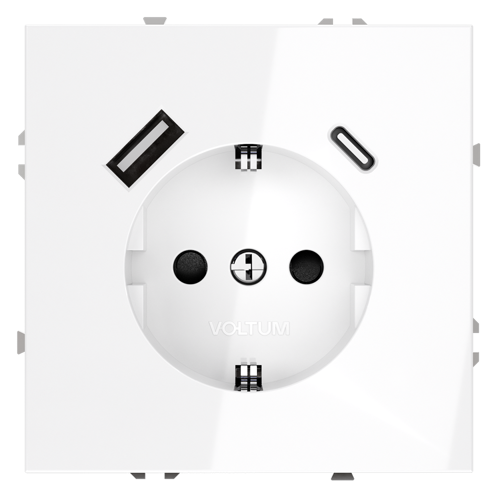 Розетка встраиваемая VOLTUM S70 с заземлением и защитными шторками, 16А, с USB, A+С, (белый глянцевы