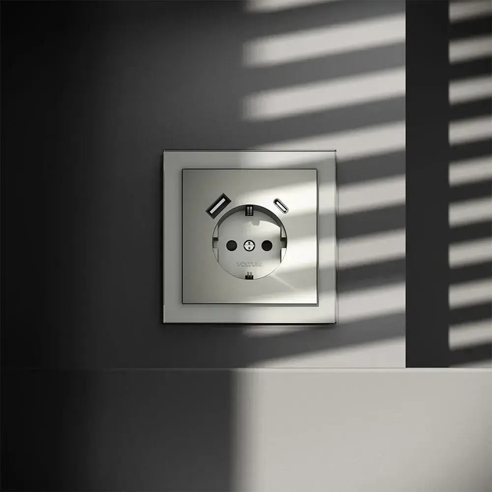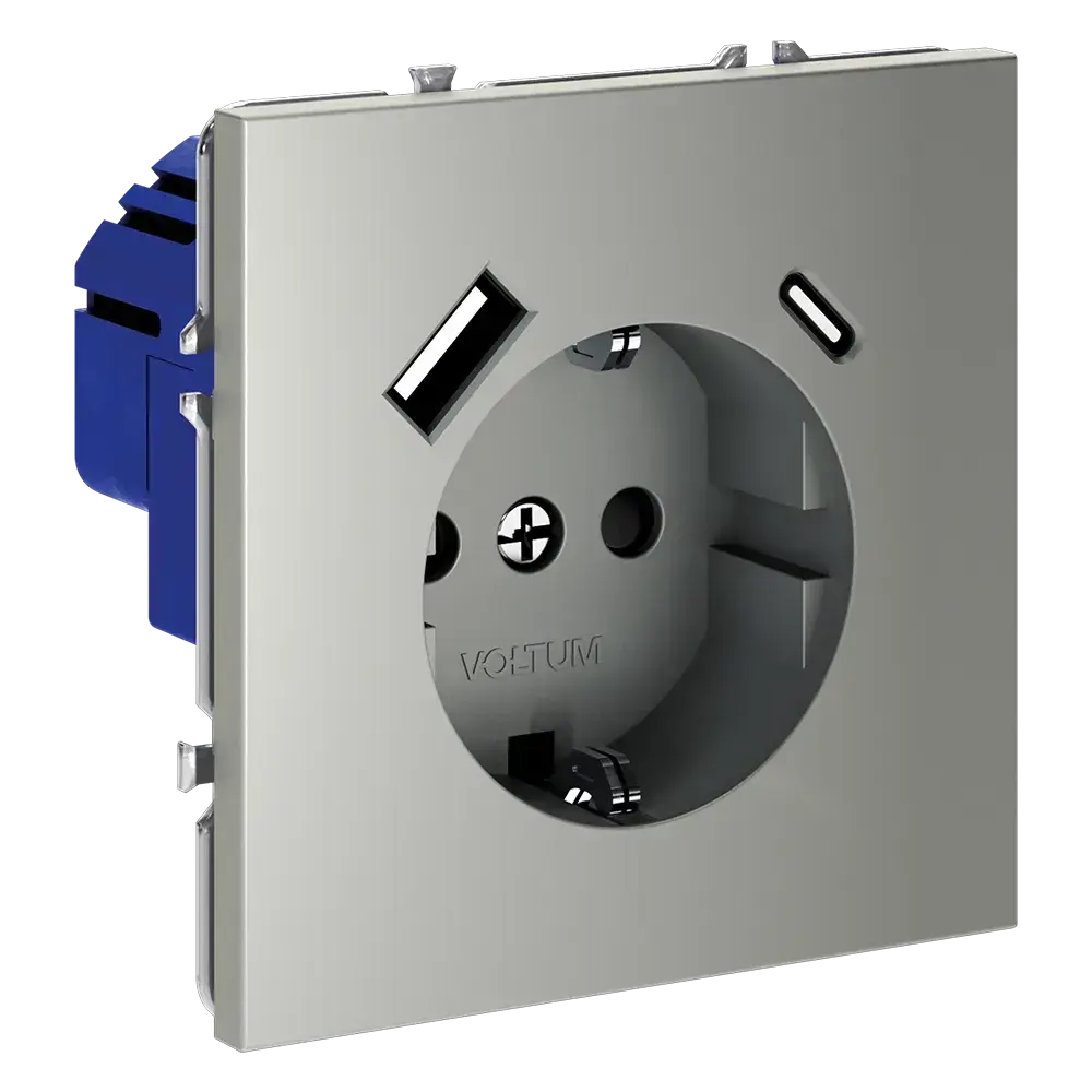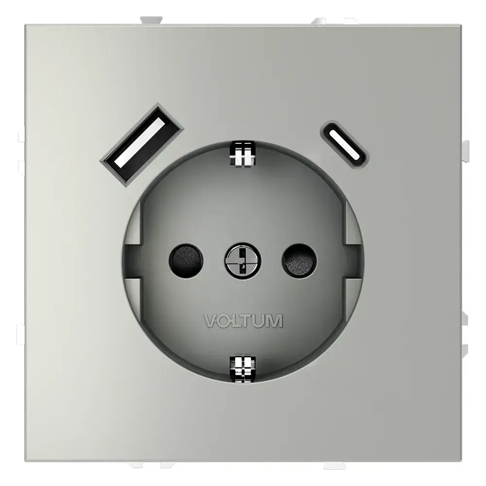 Розетка встраиваемая VOLTUM S70 с заземлением и защитными шторками, 16А, с USB, A+С, (сталь)