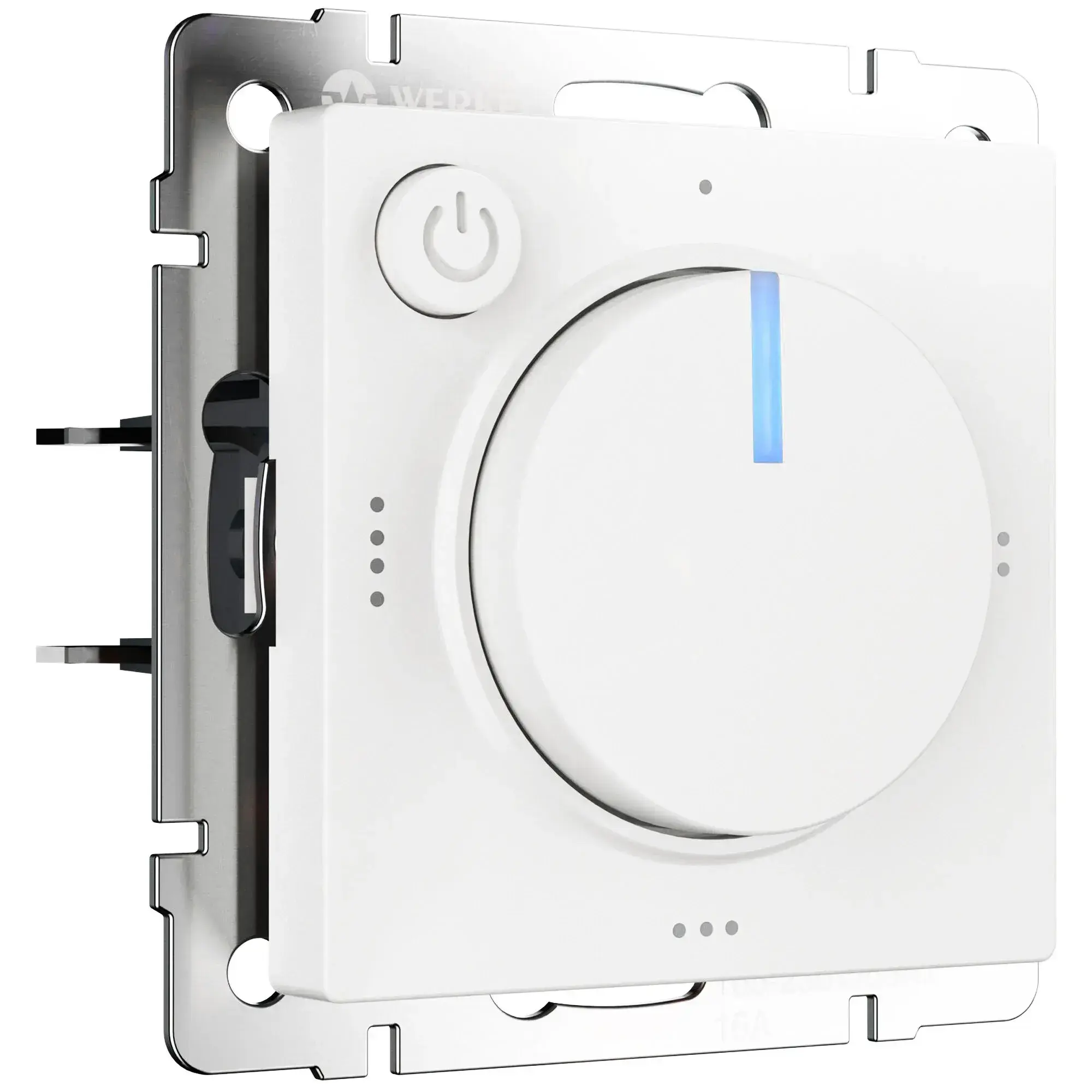 Терморегулятор электромеханический для теплого пола белый матовый W1151161 устройство разработано для регулирования температуры напольного покрытия в комнатах. Оно подходит ко всем видам теплых полов и рассчитано на максимальную мощность до 3500 Вт. Этот терморегулятор может работать с различными рамками Werkel и оборудован светодиодной индикацией, отображающей текущий режим работы. Максимально допустимая температура нагрева достигает 50 градусов Цельсия. Красный светодиод показывает процесс нагревания, а включение синей подсветки свидетельствует о достижении установленной температуры.
