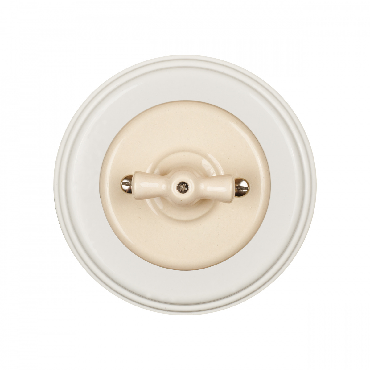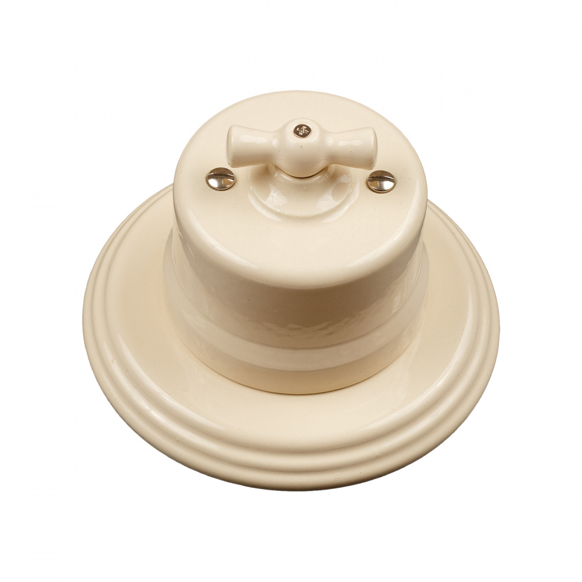 Изготовлен из экологически чистого материала – керамики. Имеет уникальный дизайн: оформлен в стиле ретро, оснащен поворотным переключателем вместо клавиши. Применяется с открытой проводкой, хорошо сочетается с текстильным кабелем. При необходимости может использоваться и при монтаже скрытой электропроводки.