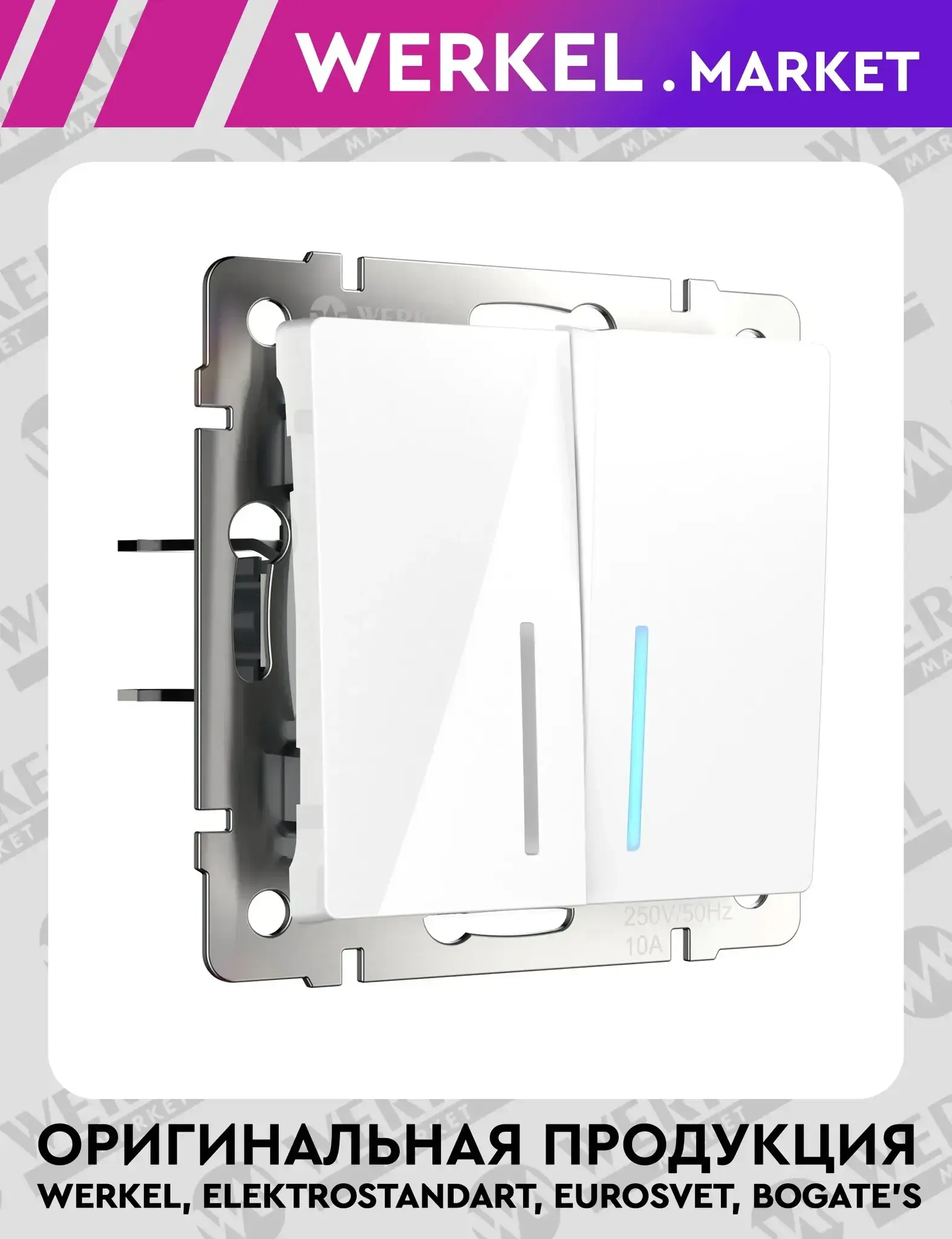 Выключатель двухклавишный проходной с подсветкой белый глянцевый W1122101 с номинальным током 10А и напряжением 250В, разработан для управления одним источником света из нескольких точек. Выключатель 2-клавишный проходной представляет собой механизм нажимного типа с металлическим суппортом и декоративными накладками. Он устанавливается в монтажную коробку, оставляя видимыми только лицевую панель и накладную рамку. Механизм для скрытого монтажа оснащён суппортом из нержавеющей стали, обеспечивающим надёжную фиксацию изделия в подрозетнике. Контакты обладают высокой надёжностью и способны выдерживать значительные нагрузки, а их ресурс составляет 40 000 циклов. Накладки изготовлены из высококачественного поликарбоната, устойчивого к высоким температурам. Одноклавишный проходной отличается удобством использования, безопасностью и стабильностью срабатывания механизма.