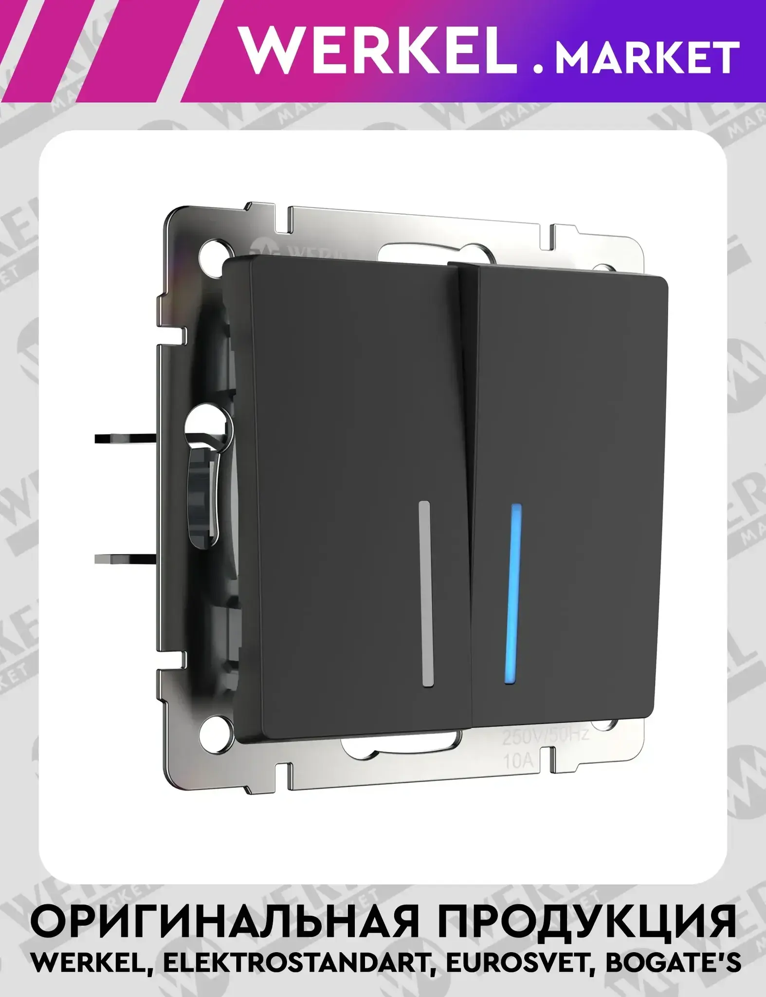 Выключатель двухклавишный проходной с подсветкой черный матовый W1122108 с номинальным током 10А и напряжением 250В, разработан для управления одним источником света из нескольких точек. Мягкий свет от светодиодов дает возможность без труда обнаружить выключатель ночью и помогает ориентироваться в квартире, доме или другом помещении. Выключатель 2-клавишный проходной представляет собой механизм нажимного типа с металлическим суппортом и декоративными накладками. Он устанавливается в монтажную коробку, оставляя видимыми только лицевую панель и накладную рамку. Механизм для скрытого монтажа оснащён суппортом из нержавеющей стали, обеспечивающим надёжную фиксацию изделия в подрозетнике. Контакты обладают высокой надёжностью и способны выдерживать значительные нагрузки, а их ресурс составляет 40 000 циклов. Накладки изготовлены из высококачественного поликарбоната, устойчивого к высоким температурам. Одноклавишный проходной отличается удобством использования, безопасностью и стабильностью срабатывания механизма.