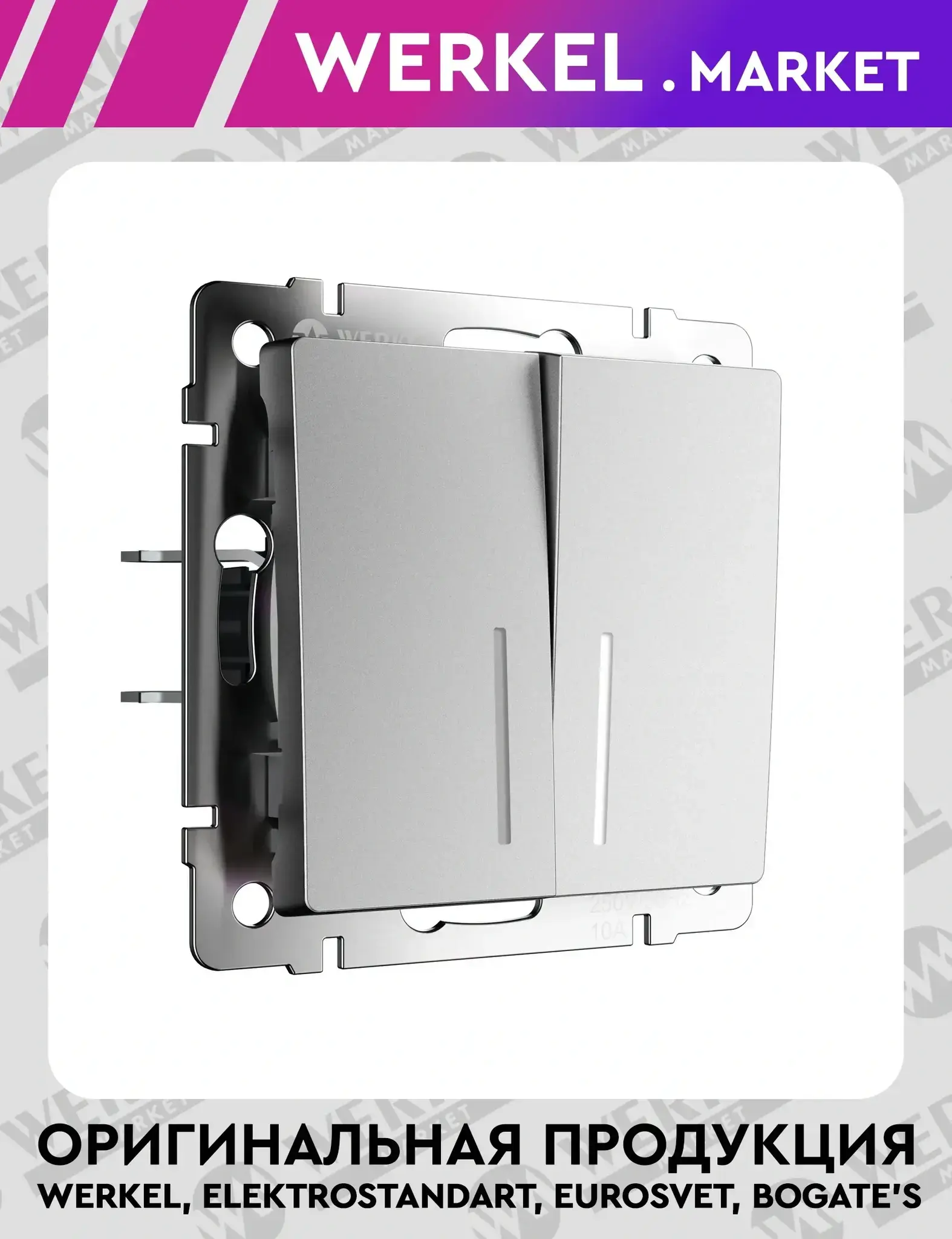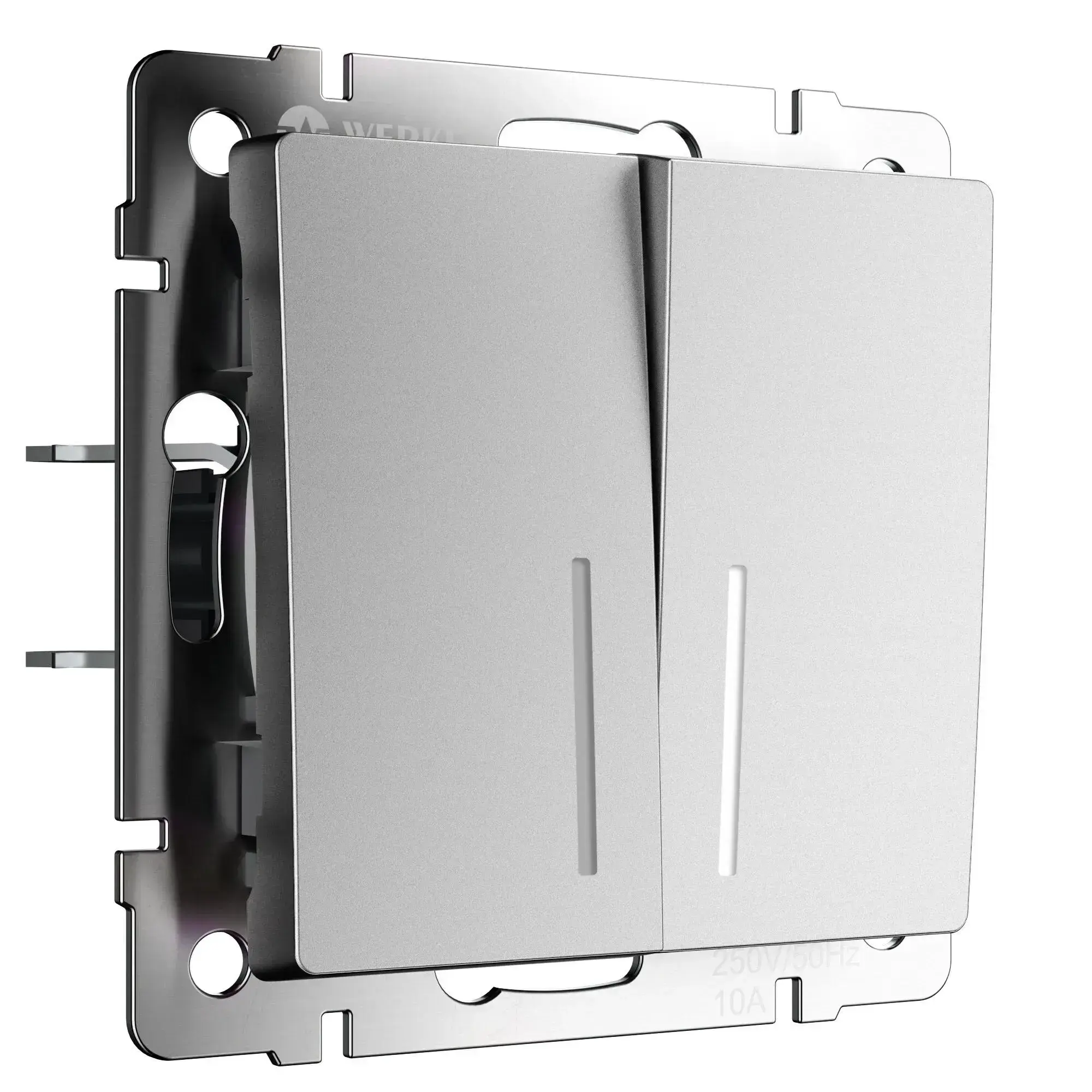 Выключатель двухклавишный проходной с подсветкой серебряный матовый W1122165 с номинальным током 10А и напряжением 250В, разработан для управления одним источником света из нескольких точек. Выключатель 1-клавишный проходной представляет собой механизм нажимного типа с металлическим суппортом и декоративными накладками. Он устанавливается в монтажную коробку, оставляя видимыми только лицевую панель и накладную рамку. Механизм для скрытого монтажа оснащён суппортом из нержавеющей стали, обеспечивающим надёжную фиксацию изделия в подрозетнике. Контакты обладают высокой надёжностью и способны выдерживать значительные нагрузки, а их ресурс составляет 40 000 циклов. Накладки изготовлены из высококачественного поликарбоната, устойчивого к высоким температурам. Одноклавишный проходной отличается удобством использования, безопасностью и стабильностью срабатывания механизма.