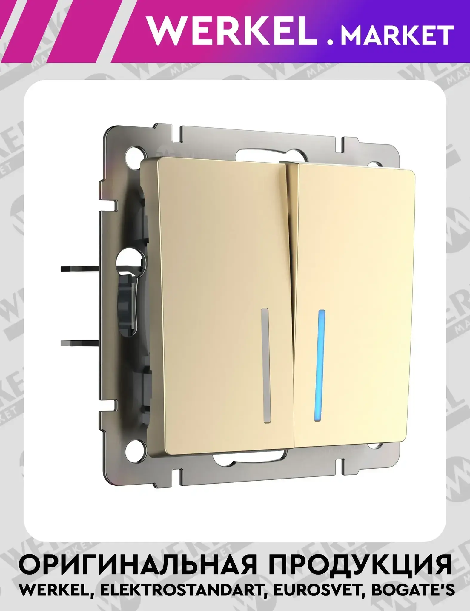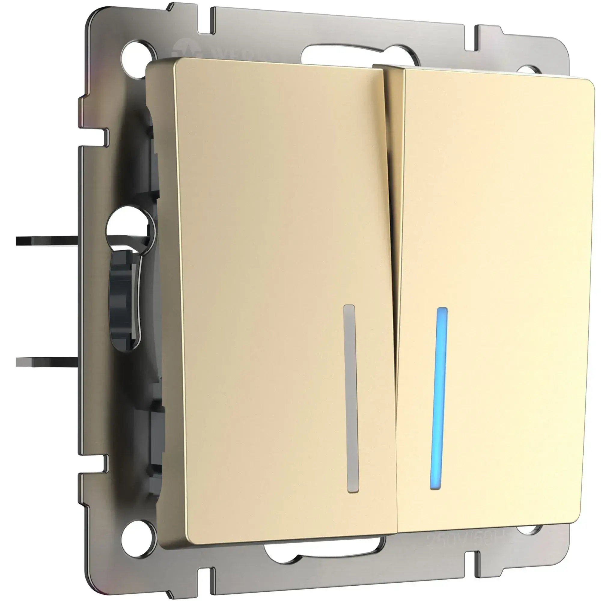 Выключатель двухклавишный проходной с подсветкой шампань W1122111 рассчитан на 10А и 250В - представляет собой механизм нажимного типа с металлическим суппортом и декоративными накладками. Тусклый свет светодиодов облегчает поиск выключателя в тёмное время суток и помогает ориентироваться в квартире, доме или комнате. Механизм одноклавишного выключателя для скрытого монтажа оснащён суппортом из нержавеющей стали, который обеспечивает надёжное крепление изделия в подрозетнике. Контакты из фосфористой бронзы и серебра обладают высокой надёжностью и способны выдерживать большие нагрузки, а их ресурс составляет 40 тысяч циклов. Накладки изготовлены из высококачественного поликарбоната, устойчивого к высоким температурам. Механизм имеет удобный способ подключения проводов с сечением от 0,75 мм² до 2,5 мм². Одноклавишный встраиваемый выключатель удобен в использовании, безопасен и стабильно срабатывает. Механизмы выключателей комбинируются с любыми рамками Werkel. Совместимость дает большой простор в создании множества уникальных сочетаний.