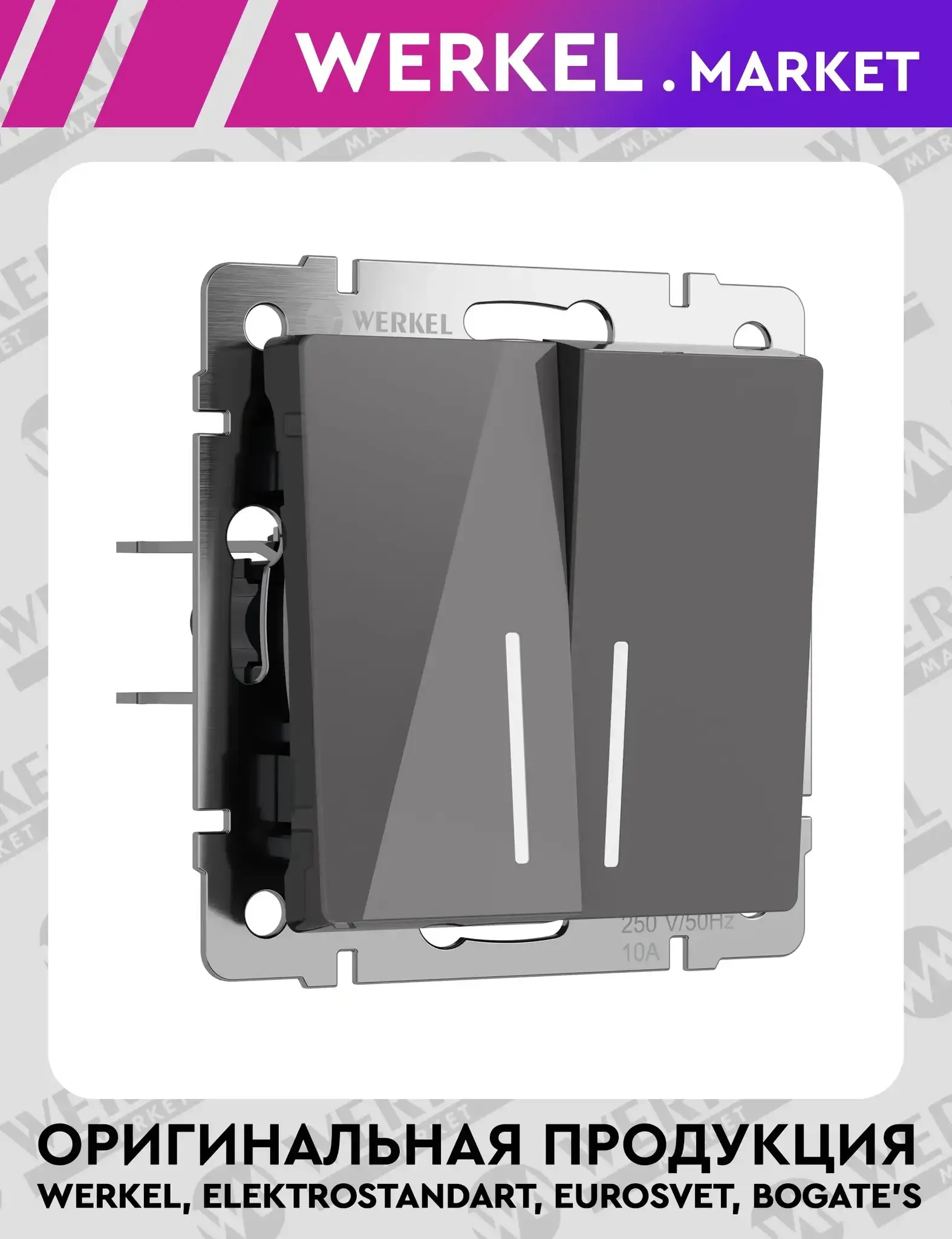 Выключатель двухклавишный с подсветкой графит акрил W1120144 рассчитан на 10А и 250В - представляет собой механизм нажимного типа с металлическим суппортом и декоративными накладками. Тусклый свет светодиодов облегчает поиск выключателя в тёмное время суток и помогает ориентироваться в квартире, доме или комнате. Механизм 2-клавишного выключателя для скрытого монтажа оснащён суппортом из нержавеющей стали, который обеспечивает надёжное крепление изделия в подрозетнике. Контакты из фосфористой бронзы и серебра обладают высокой надёжностью и способны выдерживать большие нагрузки, а их ресурс составляет 40 тысяч циклов. Накладки изготовлены из высококачественного поликарбоната, устойчивого к высоким температурам. Механизм имеет удобный способ подключения проводов с сечением от 0,75 мм² до 2,5 мм². Одноклавишный встраиваемый выключатель удобен в использовании, безопасен и стабильно срабатывает. Механизмы выключателей комбинируются с любыми рамками Werkel. Совместимость дает большой простор в создании множества уникальных сочетаний.