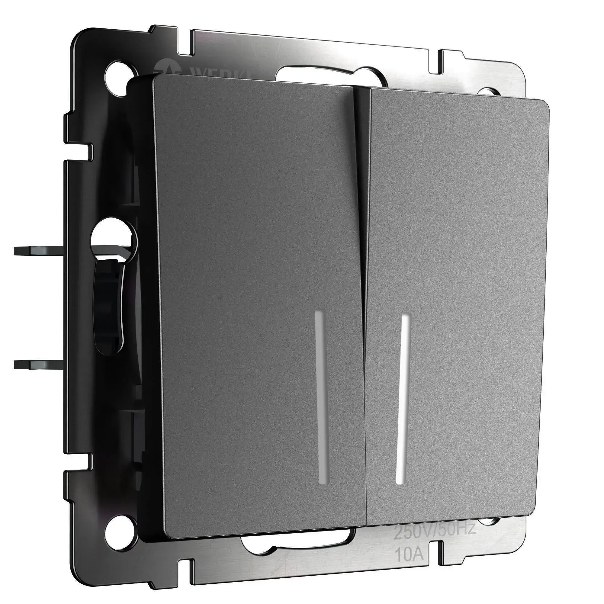 Выключатель двухклавишный с подсветкой графит матовый W1120164 рассчитан на 10А и 250В - представляет собой механизм нажимного типа с металлическим суппортом и декоративными накладками. Тусклый свет светодиодов облегчает поиск выключателя в тёмное время суток и помогает ориентироваться в квартире, доме или комнате. Механизм 2-клавишного выключателя для скрытого монтажа оснащён суппортом из нержавеющей стали, который обеспечивает надёжное крепление изделия в подрозетнике. Контакты из фосфористой бронзы и серебра обладают высокой надёжностью и способны выдерживать большие нагрузки, а их ресурс составляет 40 тысяч циклов. Накладки изготовлены из высококачественного поликарбоната, устойчивого к высоким температурам. Механизм имеет удобный способ подключения проводов с сечением от 0,75 мм² до 2,5 мм². Одноклавишный встраиваемый выключатель удобен в использовании, безопасен и стабильно срабатывает. Механизмы выключателей комбинируются с любыми рамками Werkel. Совместимость дает большой простор в создании множества уникальных сочетаний.